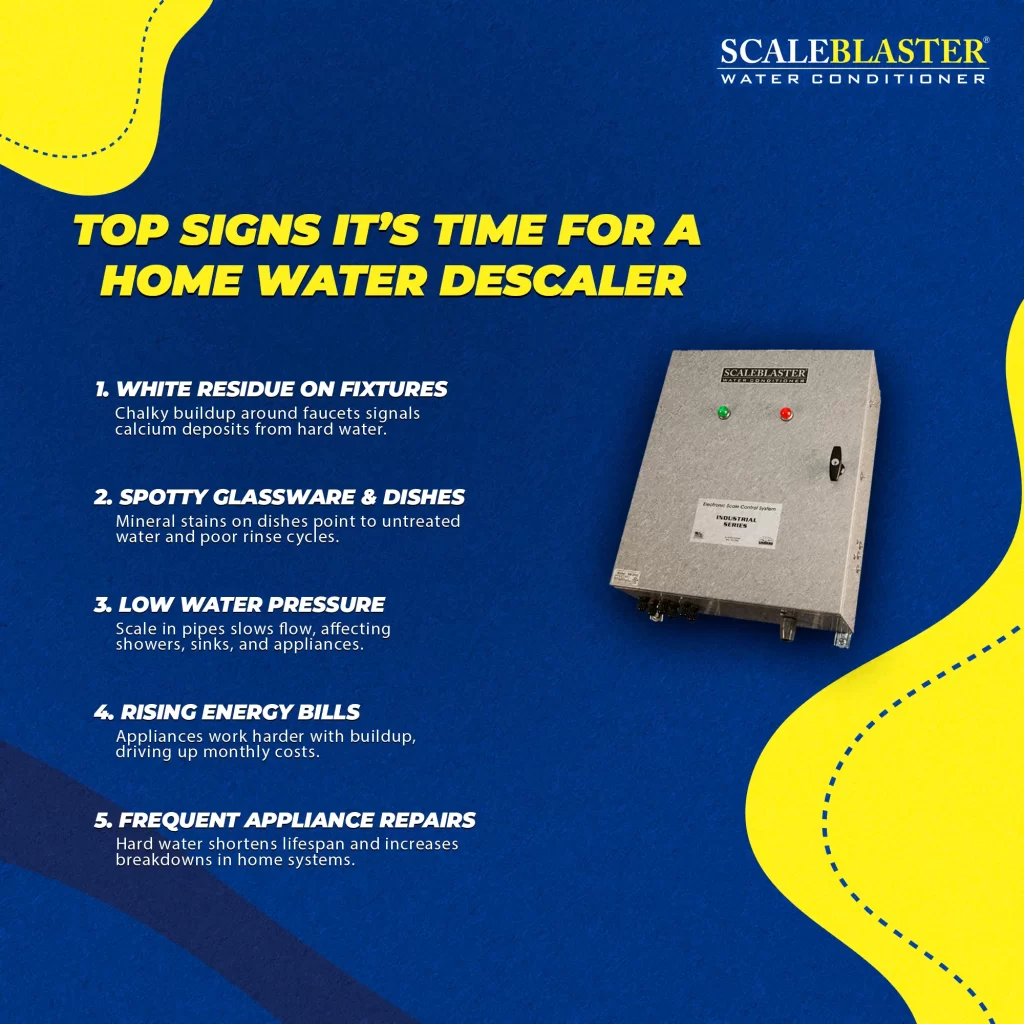 - Increased maintenance costs and frequent repairs on appliances are signs of hard water problems, warranting a descaler.